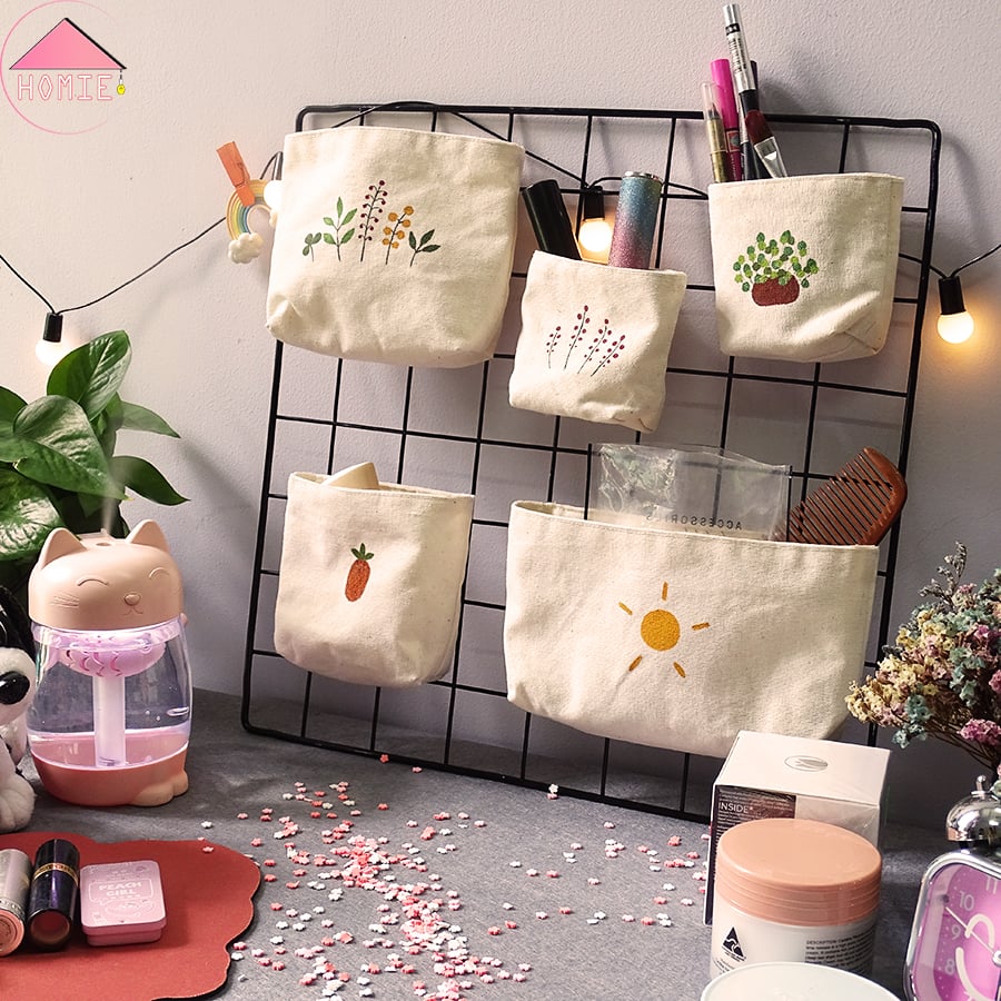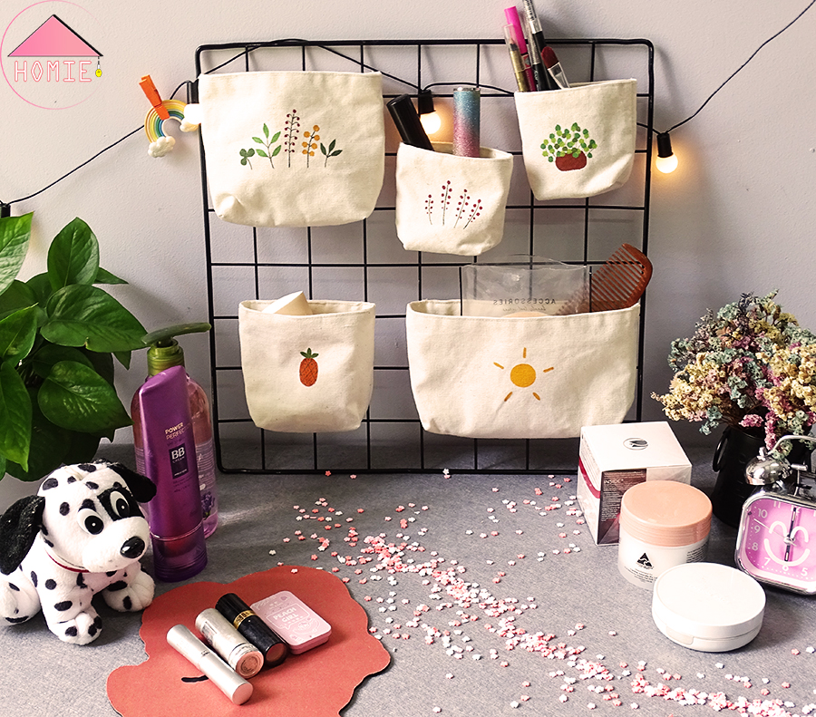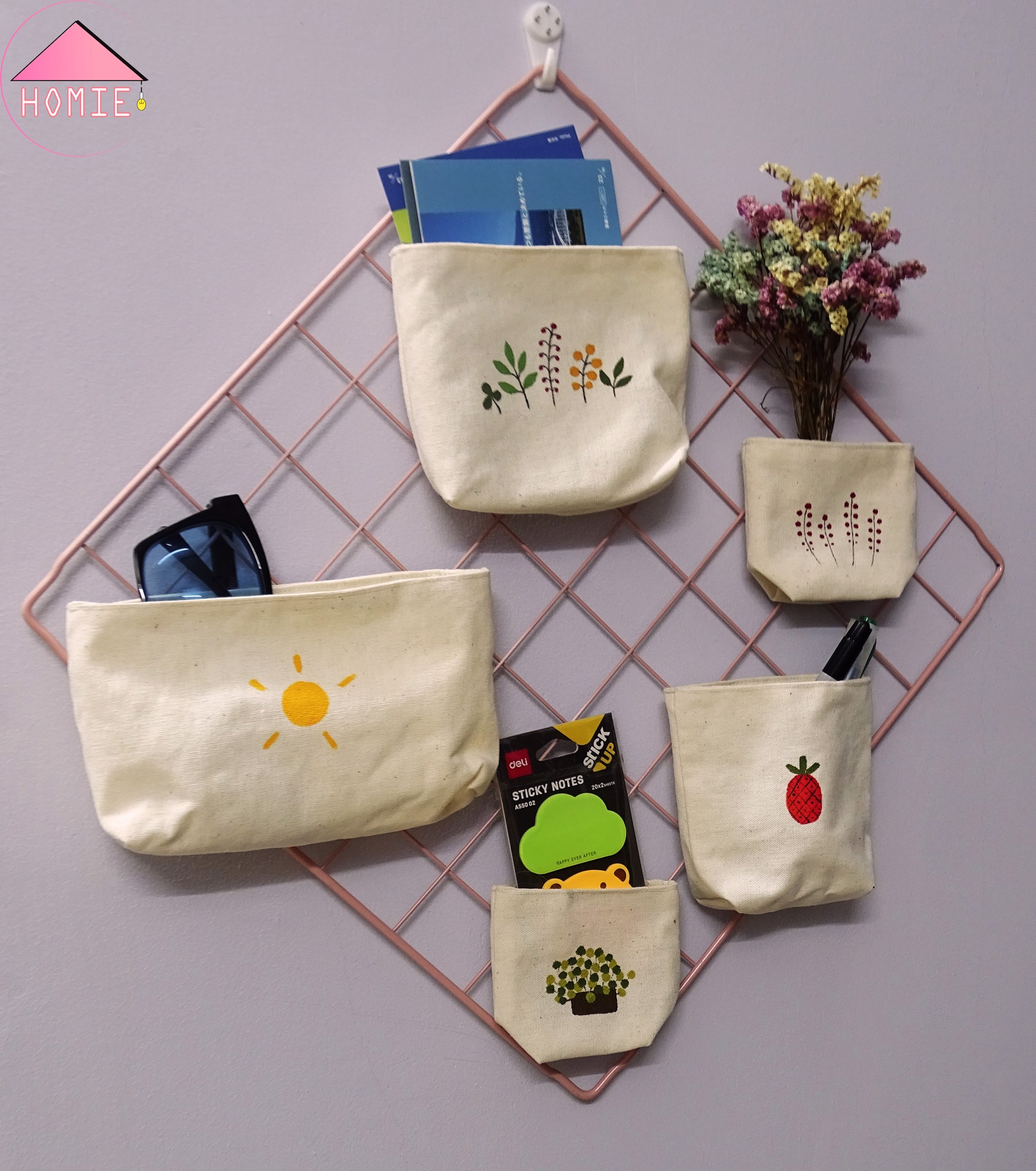 ✔️ 5 túi vải chất liệu canvas in hình xinh xắn. Đặc biệt được may kèm nam châm nên ngoài hít lên khung lưới sắt còn có thể hít lên tủ lạnh, cửa sắt…