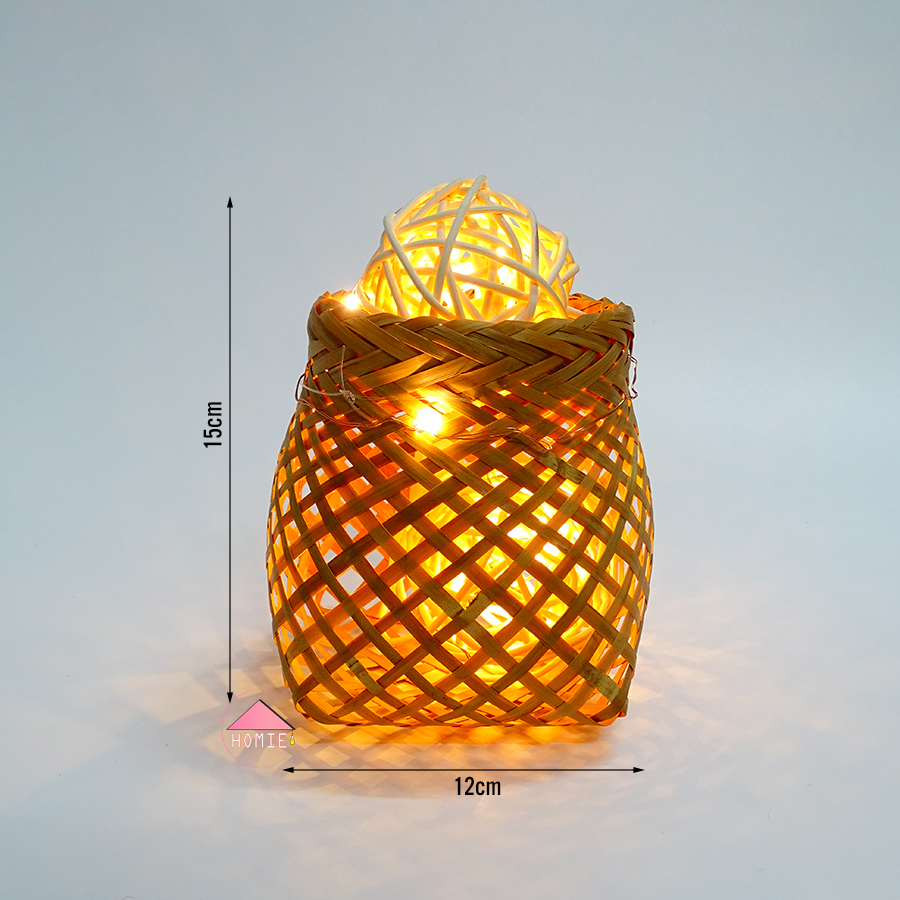 Chiếc đèn giỏ hoa được làm nguyên bản từ tre kết hợp với những quả cầu mây nhỏ xinh và dây đèn LED nhằm tạo ra ánh sáng vàng dịu êm cho mắt. Đèn có thể sử dụng trong các phòng tập yoga hoặc spa để thư giãn,.. Bên cạnh đó, mục đích mà Homie hướng đến là chiếc đèn ngủ nhỏ xinh để bàn được làm từ mây tre. Bạn hoàn toàn có thể yên tâm về ánh sáng của đèn vì đây là đèn LED nhỏ nên ánh sáng trong khắp phòng sẽ là ánh sáng vàng nhẹ, giúp bạn có một giấc ngủ sâu và giấc mơ đẹp.Các quán ăn cũng có thể trang trí theo phong cách đồng quê Việt Nam xưa, đây sẽ là một điểm nhấn ấn tượng cho không gian quán của bạn!